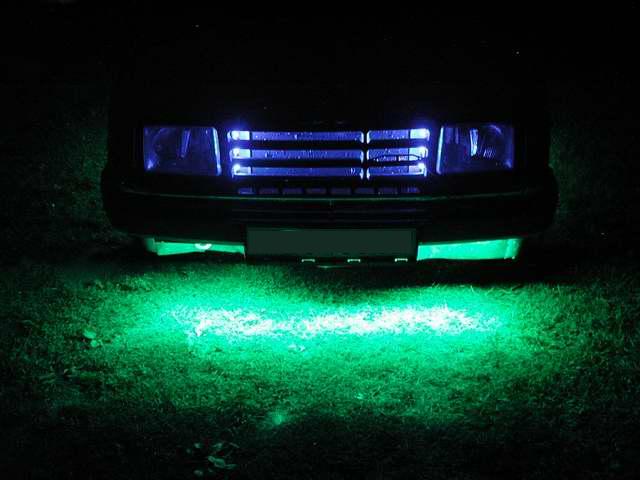 Ukázka LED neonu na Škodě 120 - Autor Alien V přední masce jsou modře svítící lišty LED neonu po 3 diodách (umístěné proti sobě) a na sponku auta uchycen zeleně svítící LED neon.